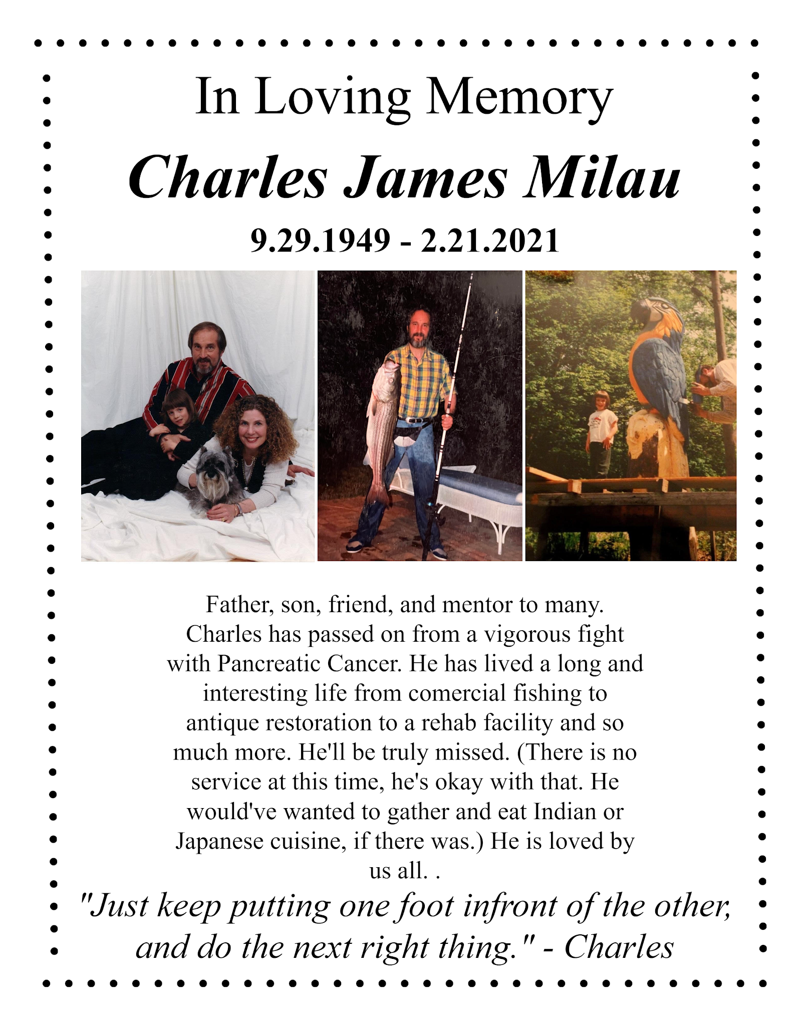That's the biggest one, my Dad. Realistically I know he's gone, I'm not in denial. I said my goodbyes and he's in a better place. But I still want to tell him stuff and expect him to come back. But I know he wont. I disconnected his phone, credit cards, there's the death certificate, all this stuff, but I still expect him to call me or text me. I made a memorial for him a couple days before he passed because my brain compelled me to do it. I've gotten rid of a bunch of expired and unused food, threw away a lot of stuff. Been getting the main part of the house cleaned up so it's functional for me. I have to go through probate, which is >.< But it's all going to work out. I know that. It's just weird. A part of me knows the house needs the little updates and such, and a part of me feels bad. But Dad had said it's ok to let things go and get rid of things. So I don't know. But that's really it. I'm not in school right now bc of everything happening. But I'll go back obviously. I promised everyone, my dad, and myself. So yeah. I'll get a job too. Need a month off maybe two. But no longer because I love working, and I want to socialize and earn money. But I'm very thankful for my support system and the people who loved my Dad. And I'm very thankful for the relationship with my Dad before he passed. It wasn't perfect and there's still things I didn't tell him, that he didn't need to know, but I'm glad with how things ended between us. I'm still getting flashbacks of the bad times in the end but I know they'll pass. I'm sorta sleeping on my own. It takes time, I don't know how long, it doesn't have a timeframe. But yeah, the title of this post is what he told me and others. And yeah.